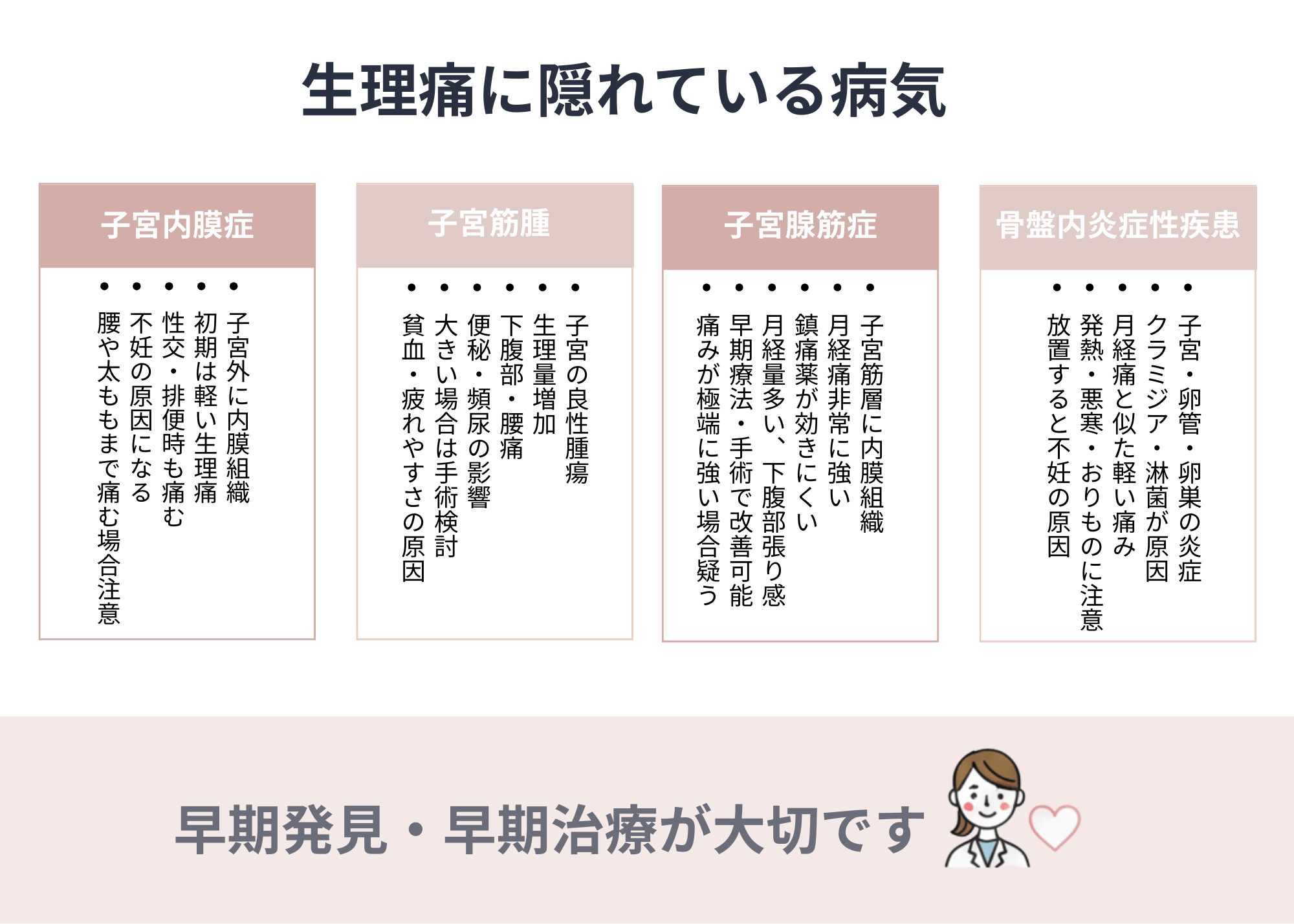 痛みを単なる「生理痛」として見過ごすのではなく、体からのサインとしてしっかり受け止めることが大切です。
