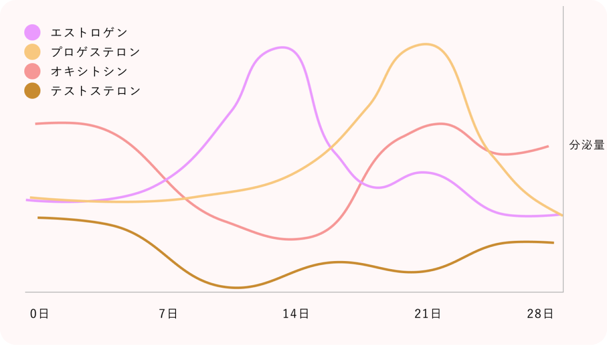生理のリズムは、卵胞ホルモン(エストロゲン)と黄体ホルモン(プロゲステロン)という2つの女性ホルモンの分泌で生まれます。