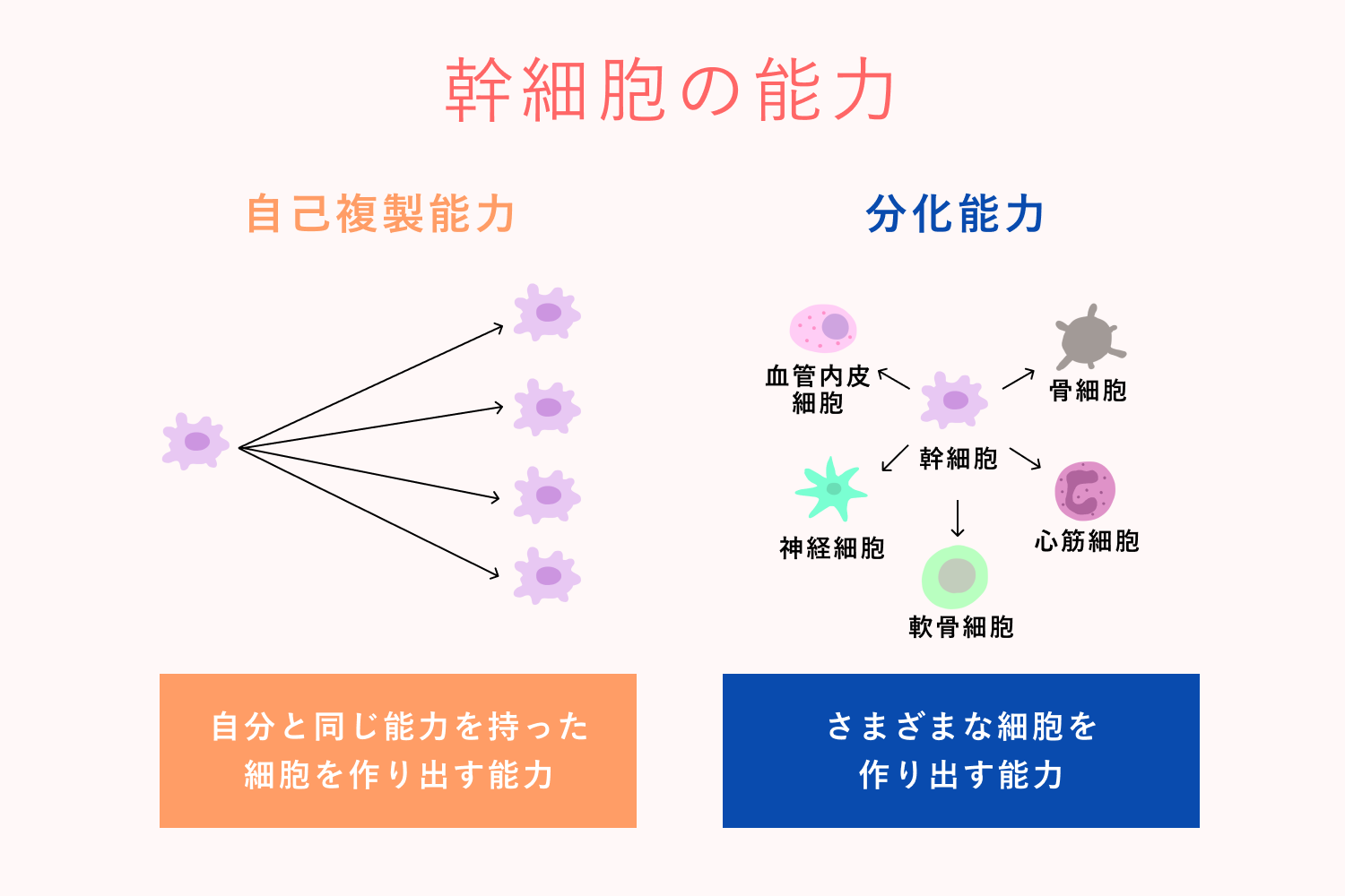 「幹細胞」とは、それらの細胞の元となる細胞のことです。