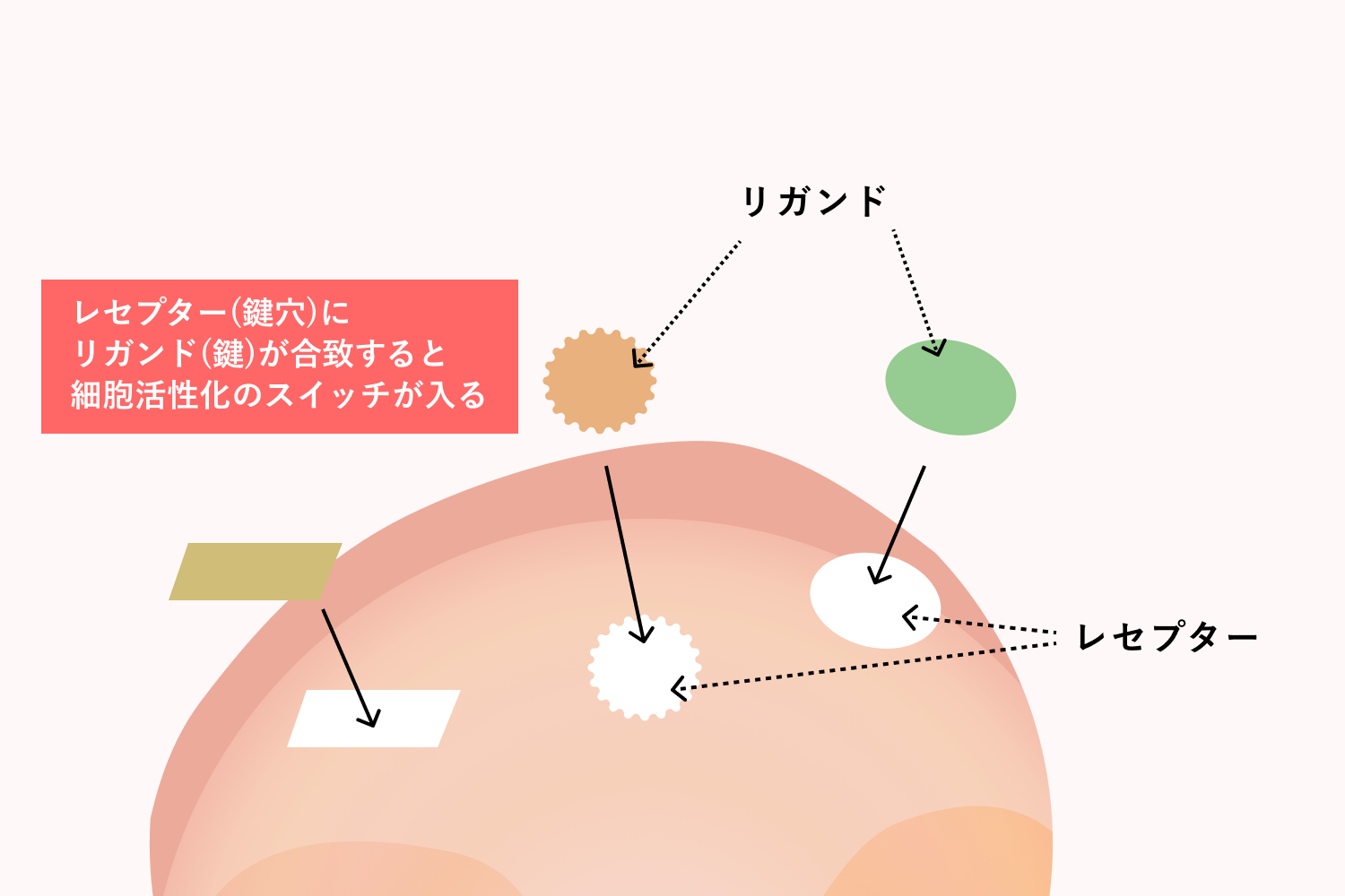 レセプターにリガンドが合致することで細胞活性化のスイッチが入り、ヒアルロン酸、コラーゲン、エラスチンなどの美容成分を作り出します。