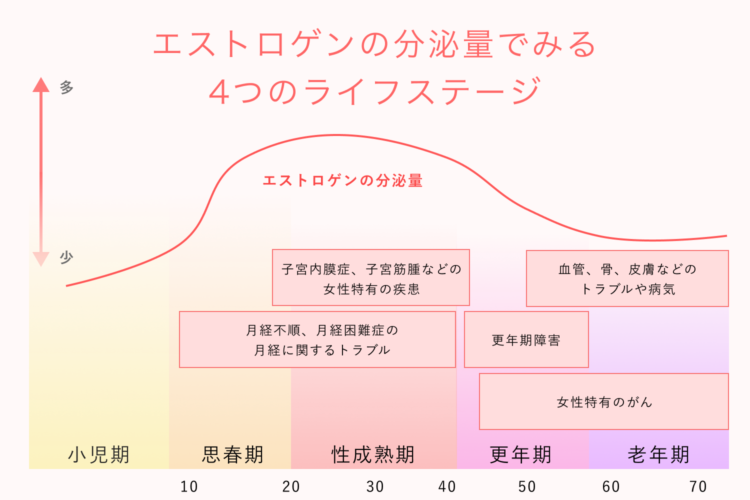 女性のライフステージは、「エストロゲン」の分泌量によって4つに分けることができます。