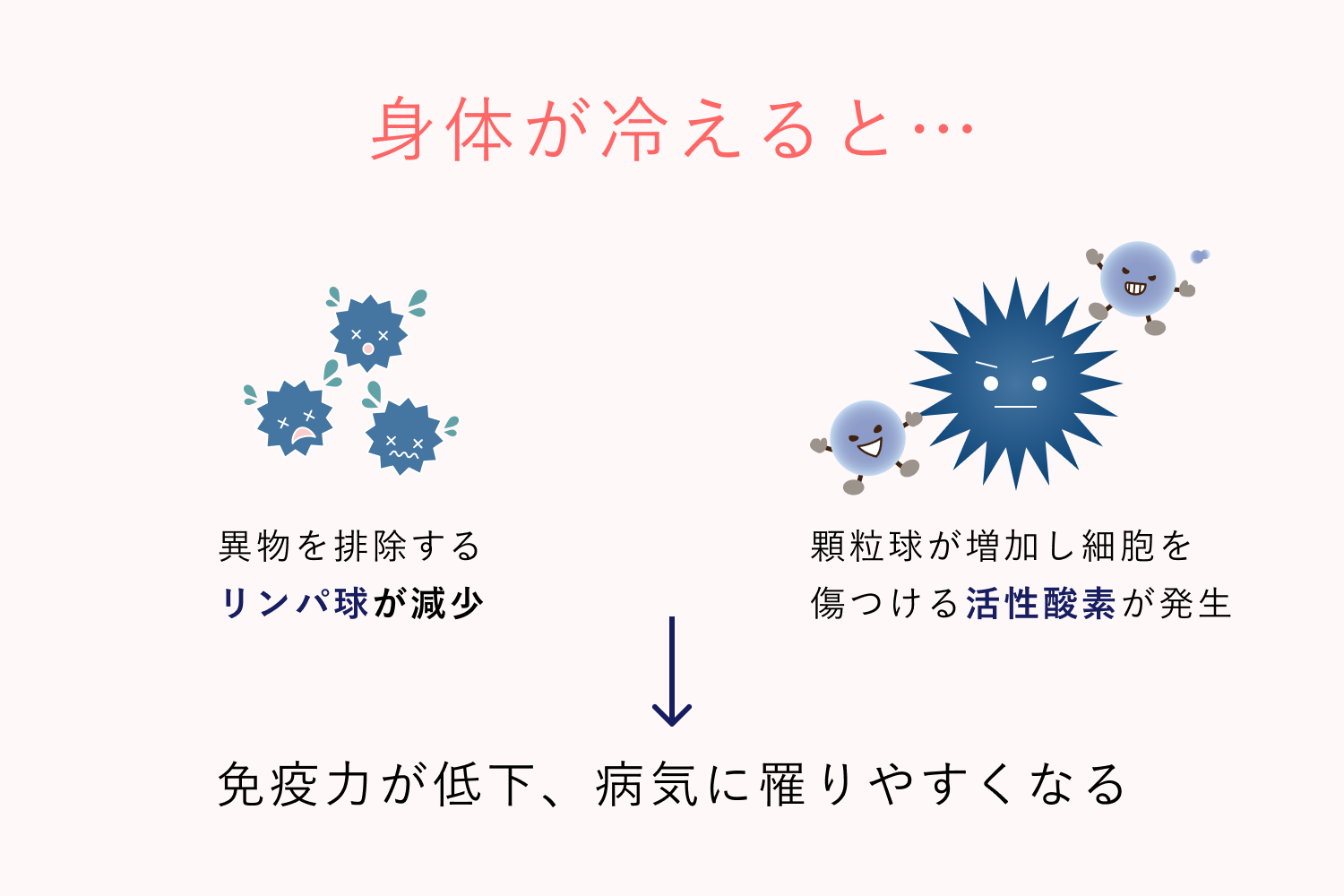 また身体が冷えることで交感神経が過剰になり、白血球のもう一種である「顆粒球」が増加しますが、顆粒球は活性酸素を発生させます。