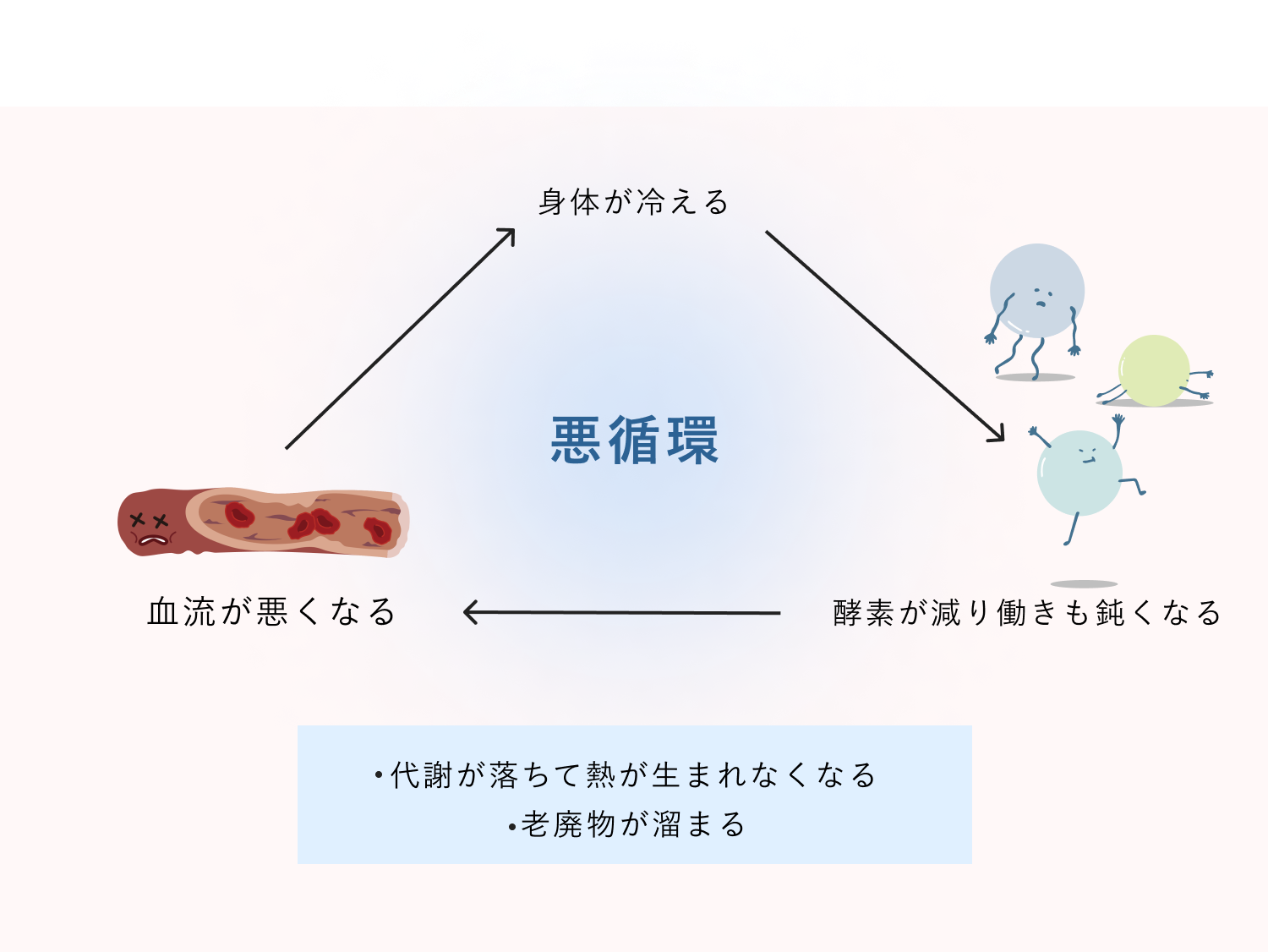 代謝が落ちると熱も生まれなくなるため体がどんどん冷え、血管内に老廃物が溜まってしまい詰まりがちになるため、さらに血流が悪くなる悪循環に陥ります。