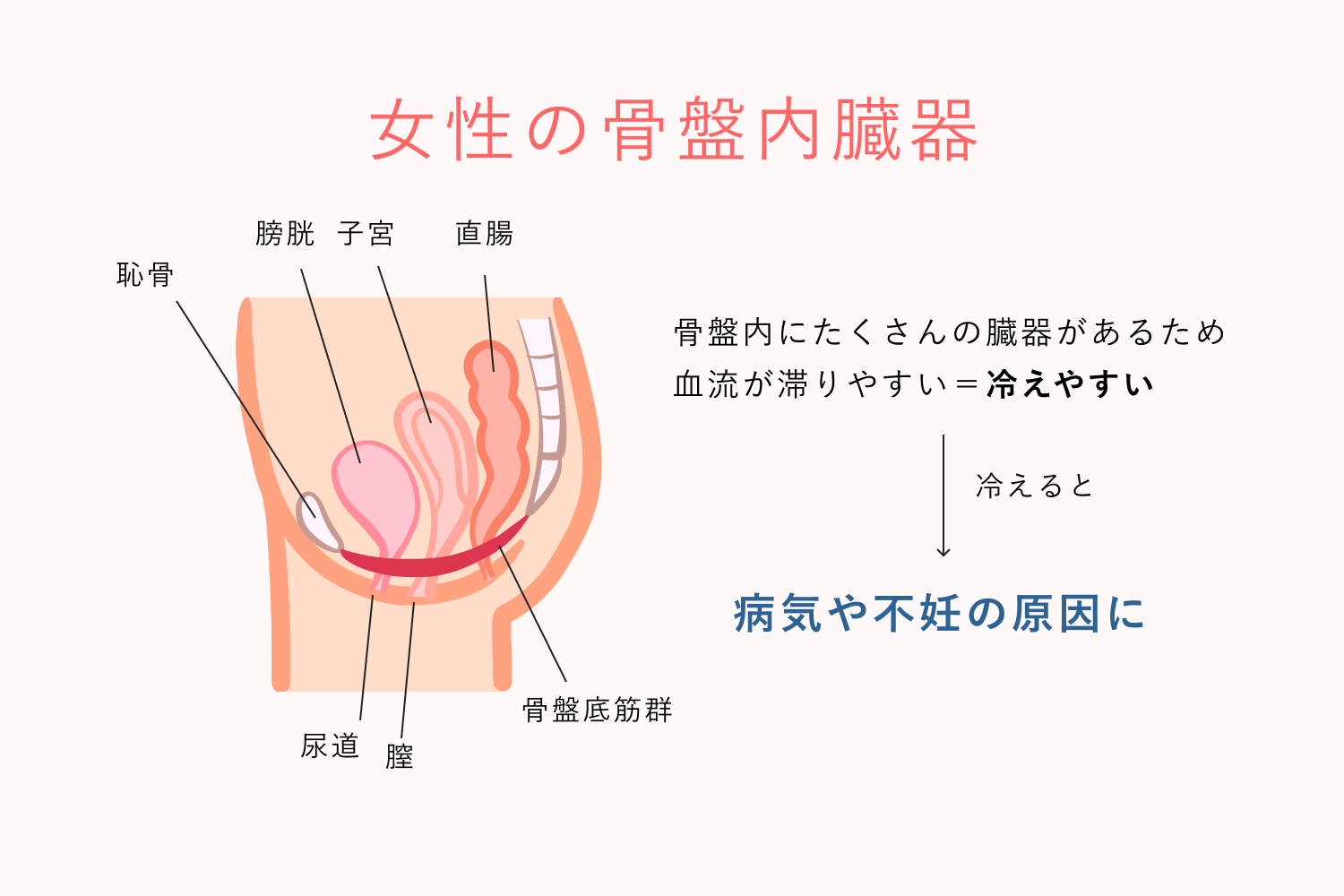 女性の骨盤の中は子宮や卵巣、膀胱や腸など多くの臓器がぎっしりと詰まっているため、もともと血が滞りやすい場所です。