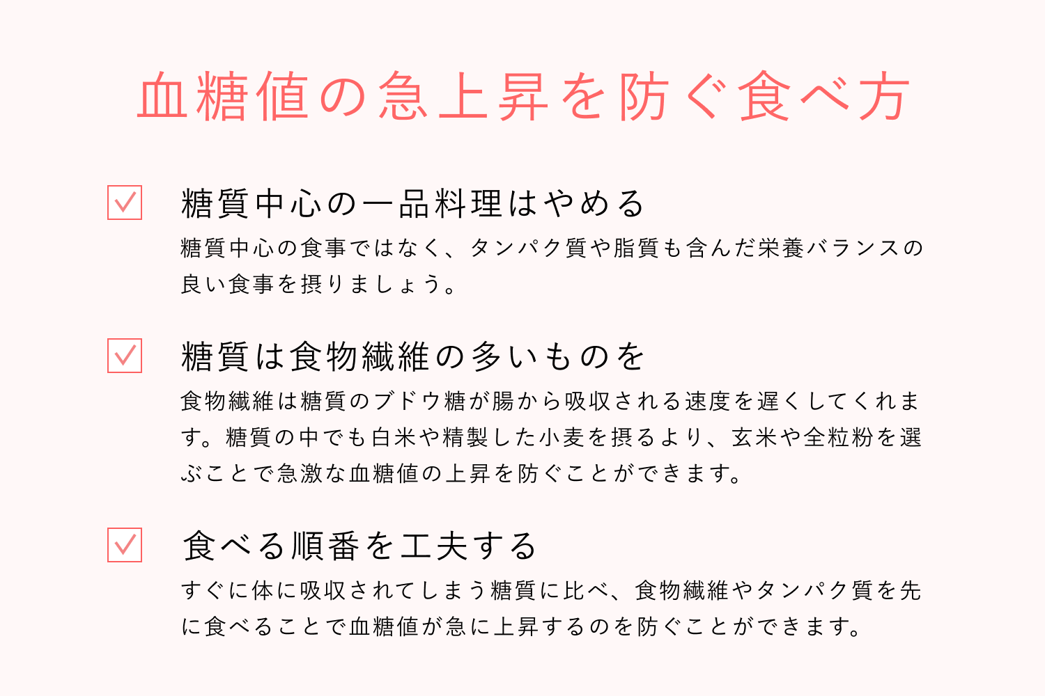 これを防ぐためにも血糖値を急激に上げないよう、食事の仕方を工夫しましょう。